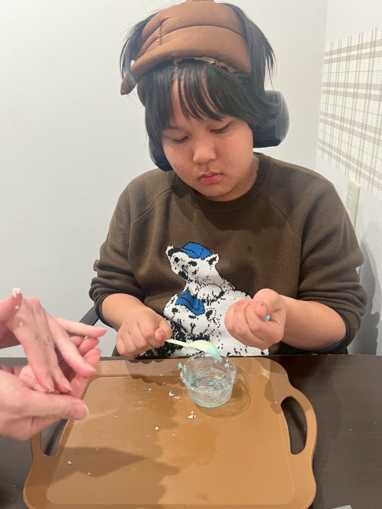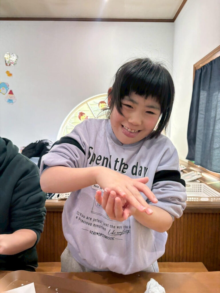 型を作ったあとは、「早く固まらないかな〜」と完成を楽しみにする様子が印象的でした。