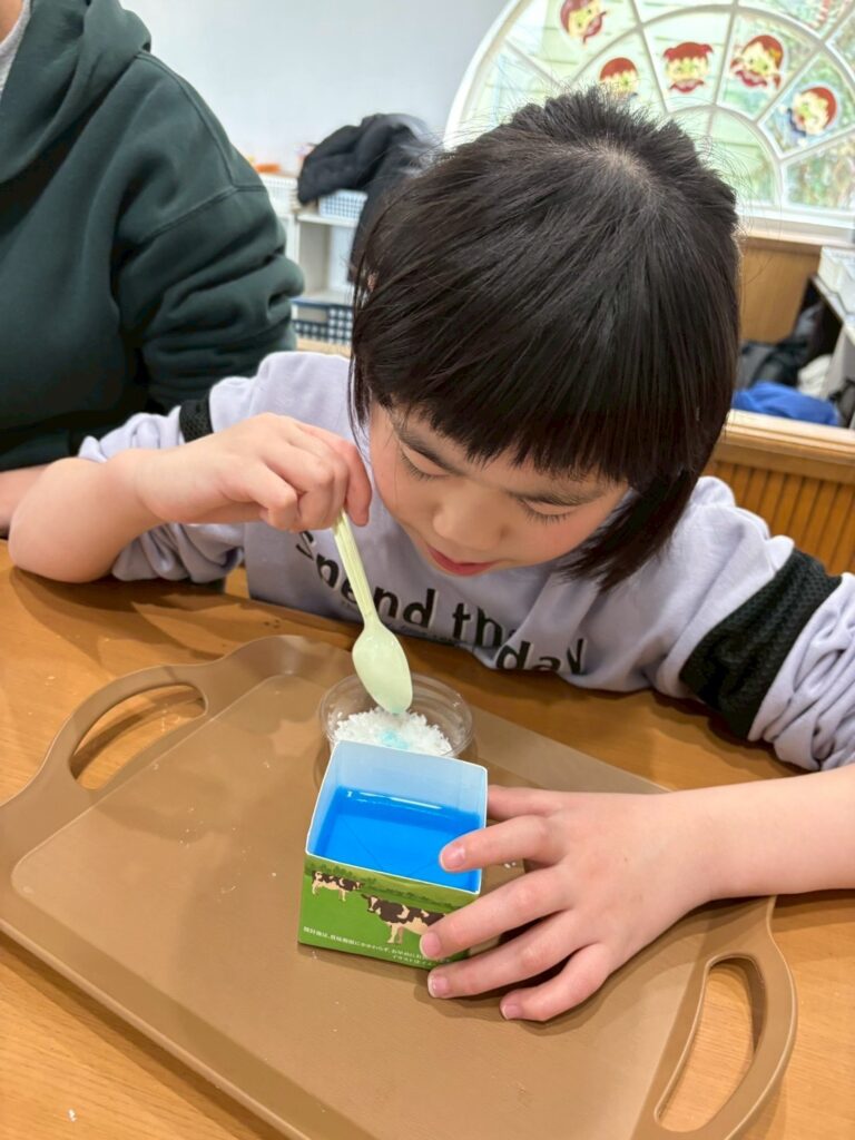 色水を少しずつ入れながら、「まだ粉かな?」「固まってきた!」と感触の変化を楽しむ子どもたち