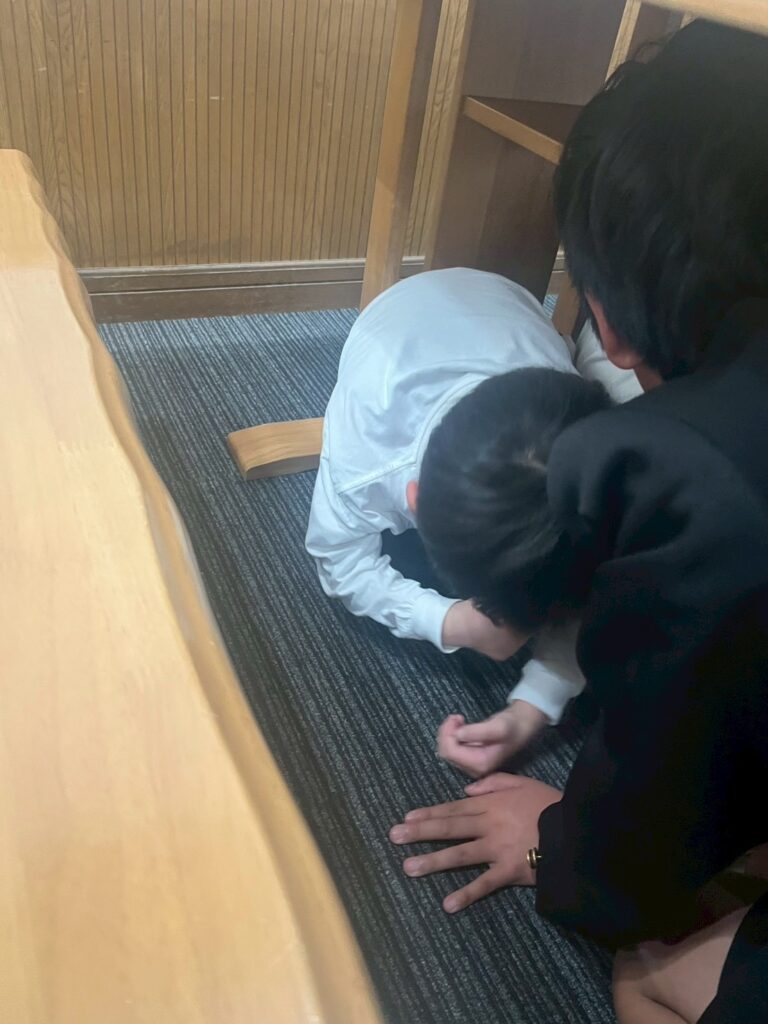 でも、職員の声をよく聞きながら、机の下に入りしっかり頭を守ることができました。