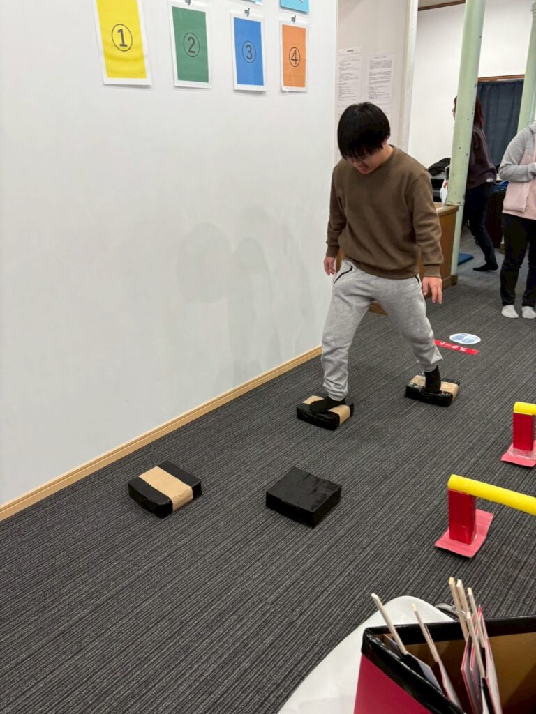 床に並べた飛び石を、一つひとつバランスを取りながら進みます。