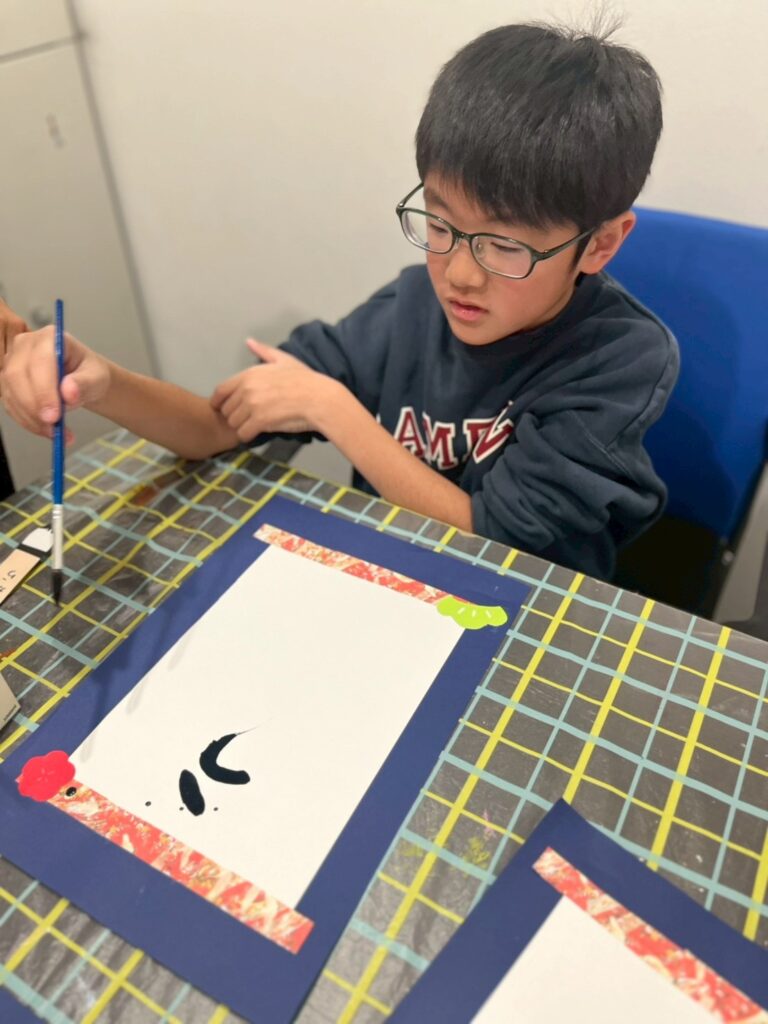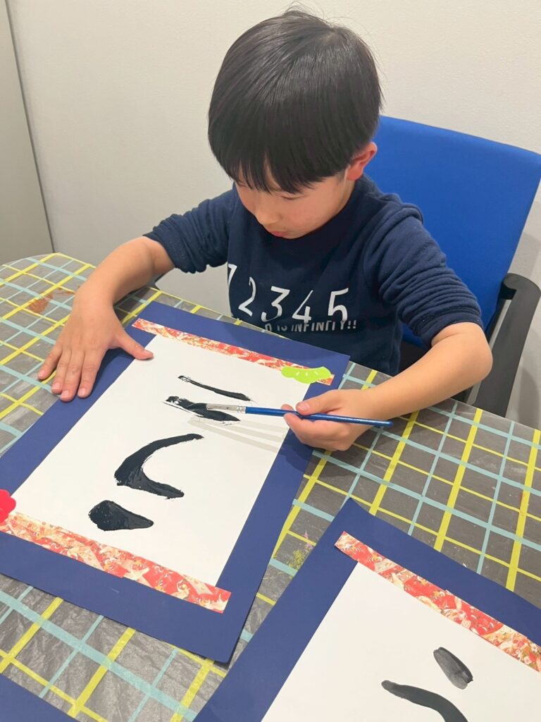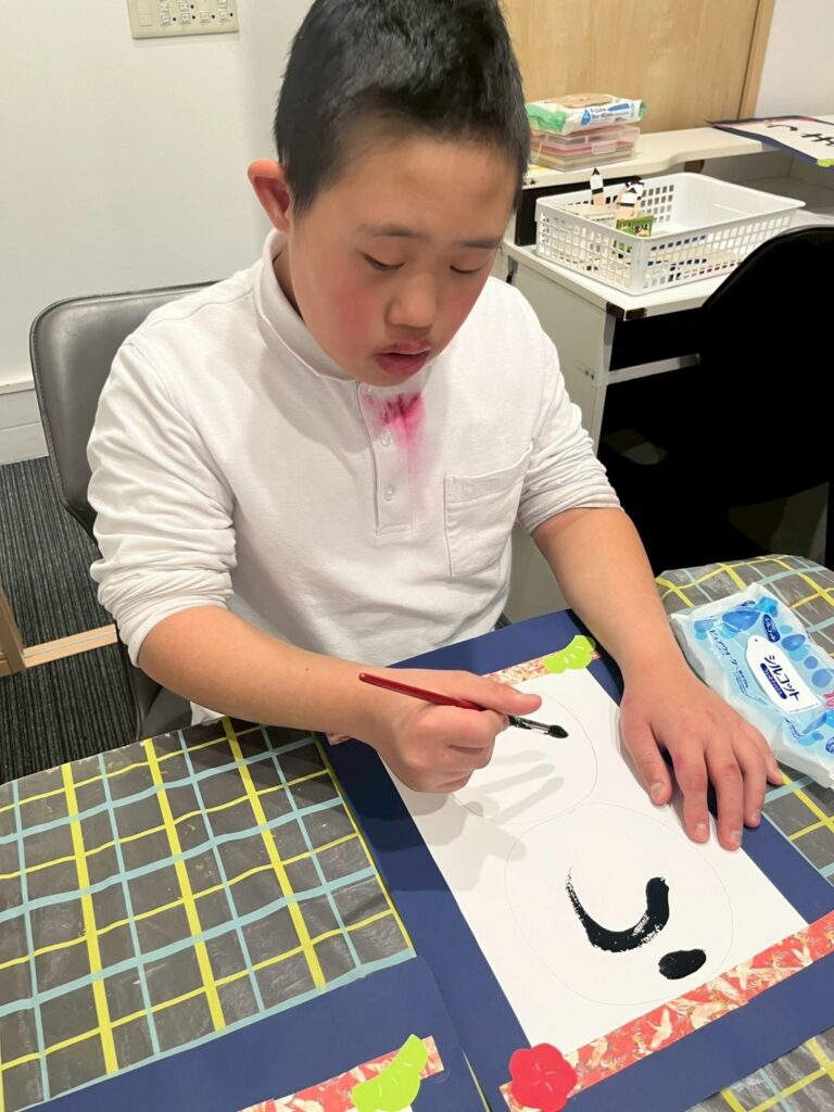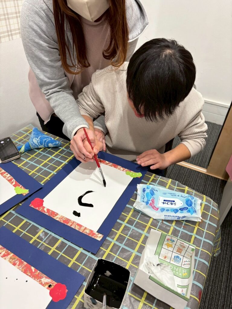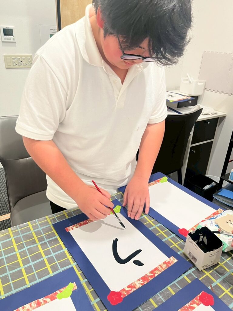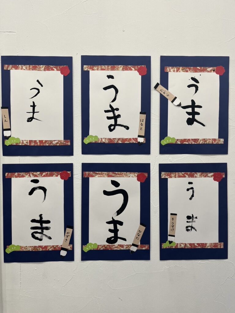 完成した文字は、同じ「うま」という文字でも、大きさや形、力強さがそれぞれ異なり、一人ひとりの個性が光る作品となりました。「ここが気に入っている」「前より上手に書けた」と、自分の作品を振り返る姿も見られ、達成感につながっていました。