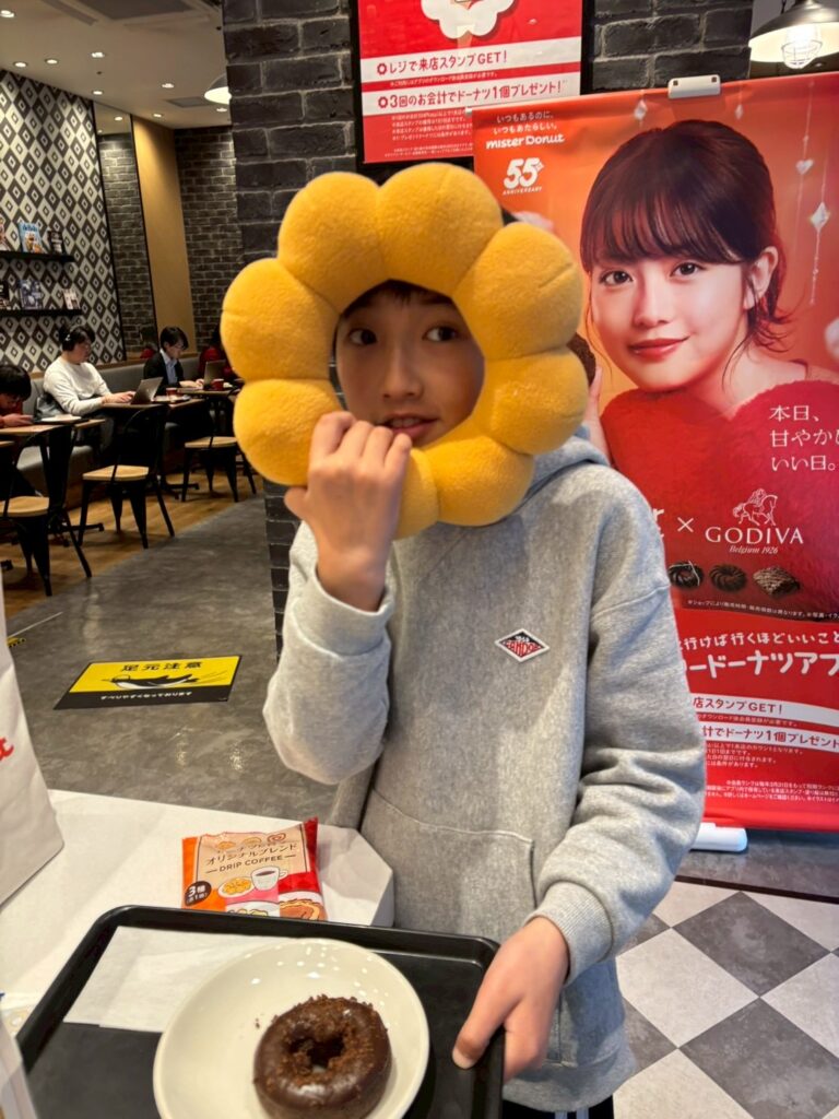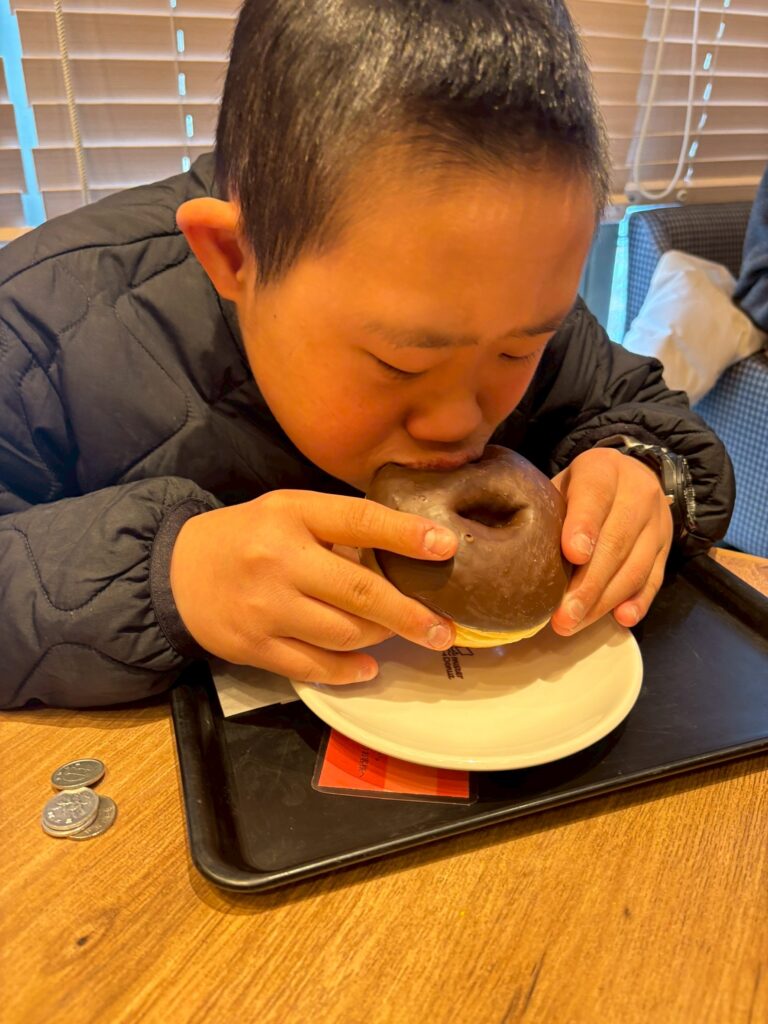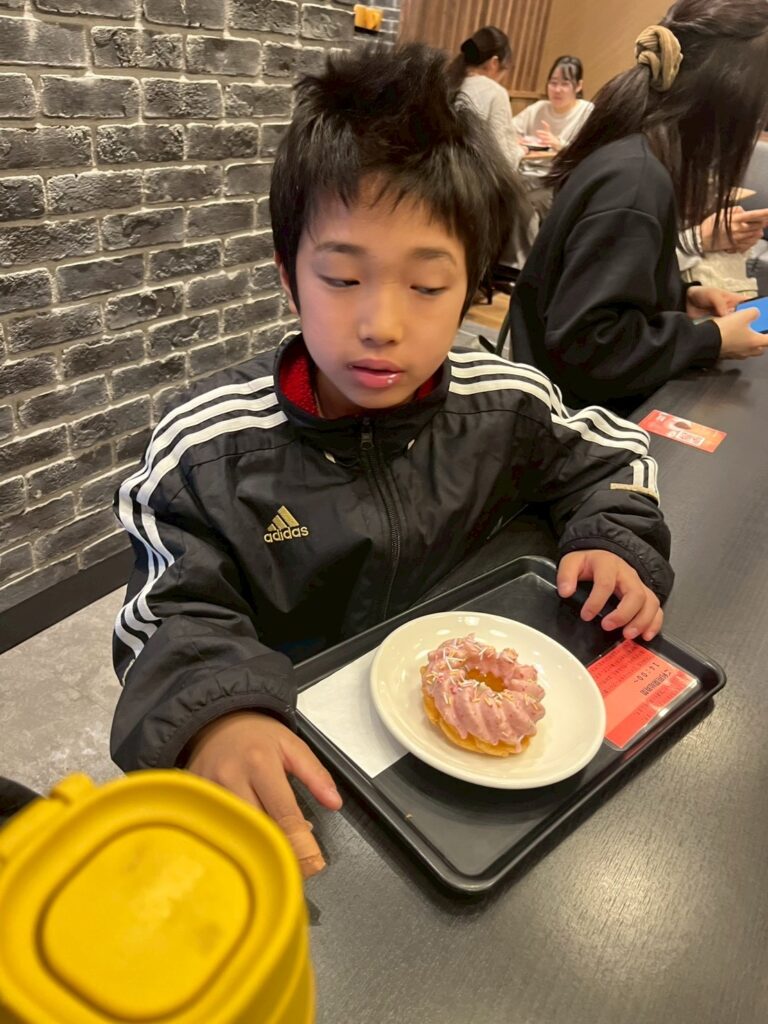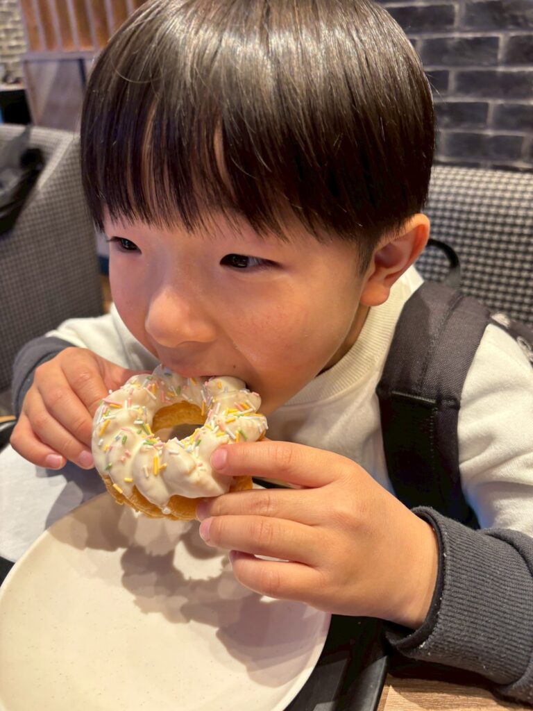 大きな口でドーナツを食べたり、「おいしい!」と笑顔がこぼれたり、落ち着いて座って食べることができていました。